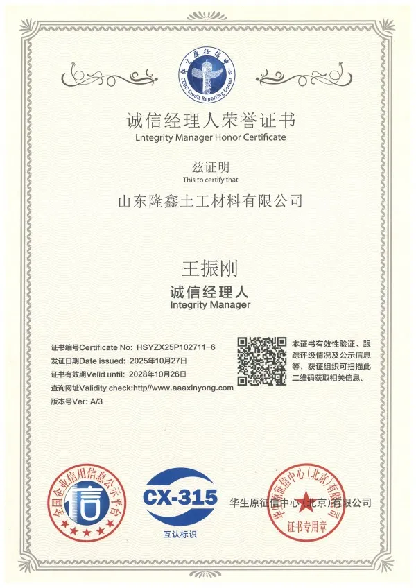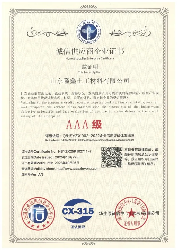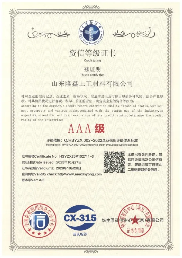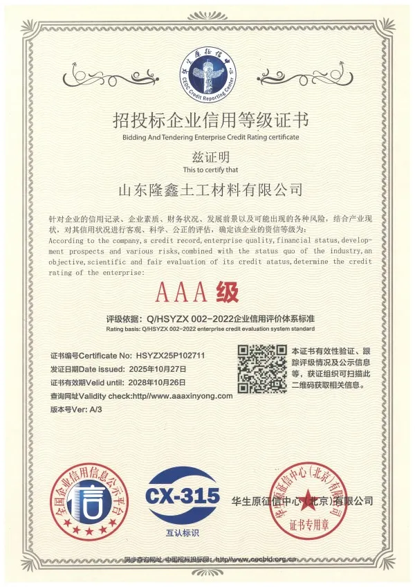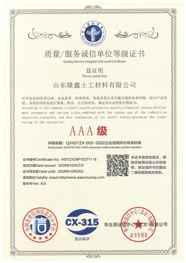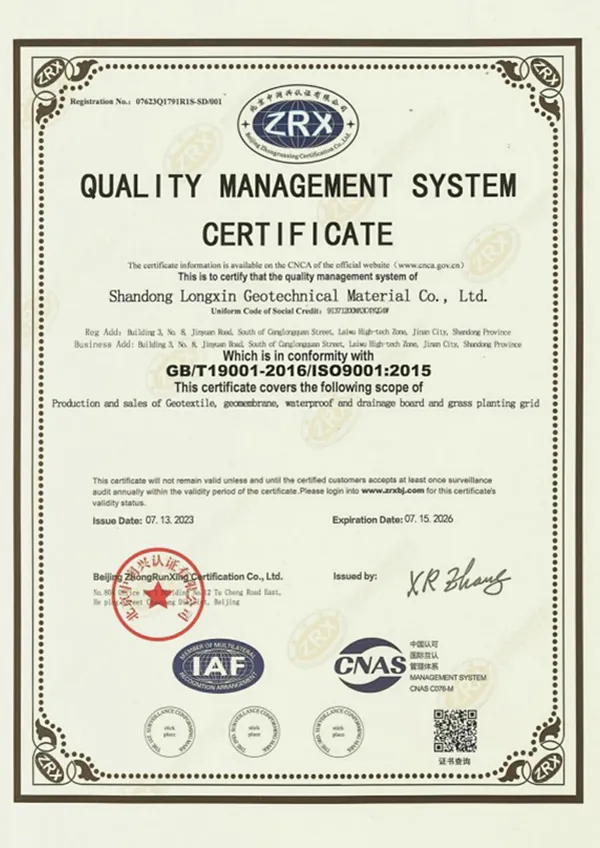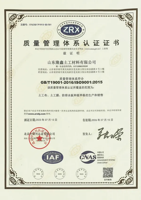 Компания успешно прошла сертификацию системы менеджмента качества на соответствие стандарту ISO 9001:2000. Строго следуя положениям «Методов управления ключевыми предприятиями по производству геосинтетических материалов», изданных Государственным комитетом по экономике и торговле, «Государственным стандартам Китайской Народной Республики», опубликованным Государственным управлением по техническому надзору, а также под руководством надежной системы обеспечения качества, производство осуществляется в строгом соответствии с государственными стандартами. Это гарантирует, что выпускаемая продукция отличается стабильным и надежным качеством и является конкурентоспособной. В последние годы продукция широко применяется в таких областях, как строительные материалы для дома, высокоскоростные железные дороги, автомобильные дороги, гидротехническое строительство и охрана окружающей среды для укрепления оснований насыпей, экологической реставрации, защиты склонов, предотвращения просачивания отходов и изоляции на соответствующих объектах. Продукция заслужила единодушное одобрение в отрасли, а также принесла заказчикам значительную экономическую и социальную выгоду. ООО Шаньдун Лунсинь Геосинтетика неизменно придерживается корпоративного духа «Лидерство в науке и технике, качество как основа, стремление к истине и инновациям, искреннее сотрудничество». В вопросах качества продукции компания неуклонно следует руководящим принципам: «Клиент прежде всего, ориентация на рынок, сервис превыше всего, качество — залог победы», постоянно повышая уровень производства и обслуживания, обеспечивая ответственность за продукцию и перед клиентами, достигая взаимовыгодного сотрудничества на рынке.
